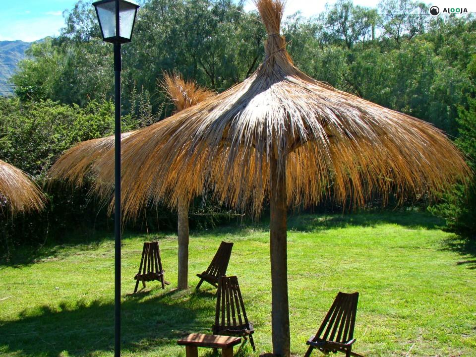** cabaña NARANJA : living (con dos camas y otra bajo carrito) cocina-comedor, baño completo con bañera hidromasaje, dormitorio matrimonial en planta alta con balcón deck aterrazado (con vista al valle, para observar la puesta del sol), equipamiento completo, muebles de algarrobo, LED TV 32" por cable, vajilla completa, microondas, cocina con horno, heladera con freezer) cafetera eléctrica, tostadora eléctrica. Parrilla individual. Estufa tiro balanceado y aire acondicionado split frio-calor Ventiladores de techo en dormitorio y living. Mesa y bancos de madera exterior